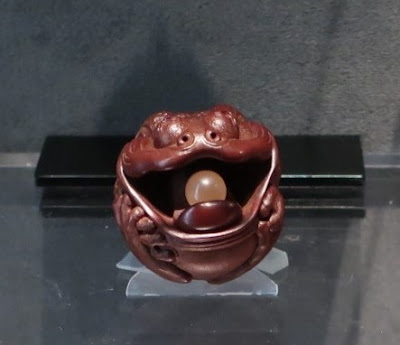 This is netsuke titled "Eating Toffee" carved from boxwood and tortoiseshell by Zanmai Onosato. I saw this 3 cm tall netsuke at Tokyo National Museum early last year.