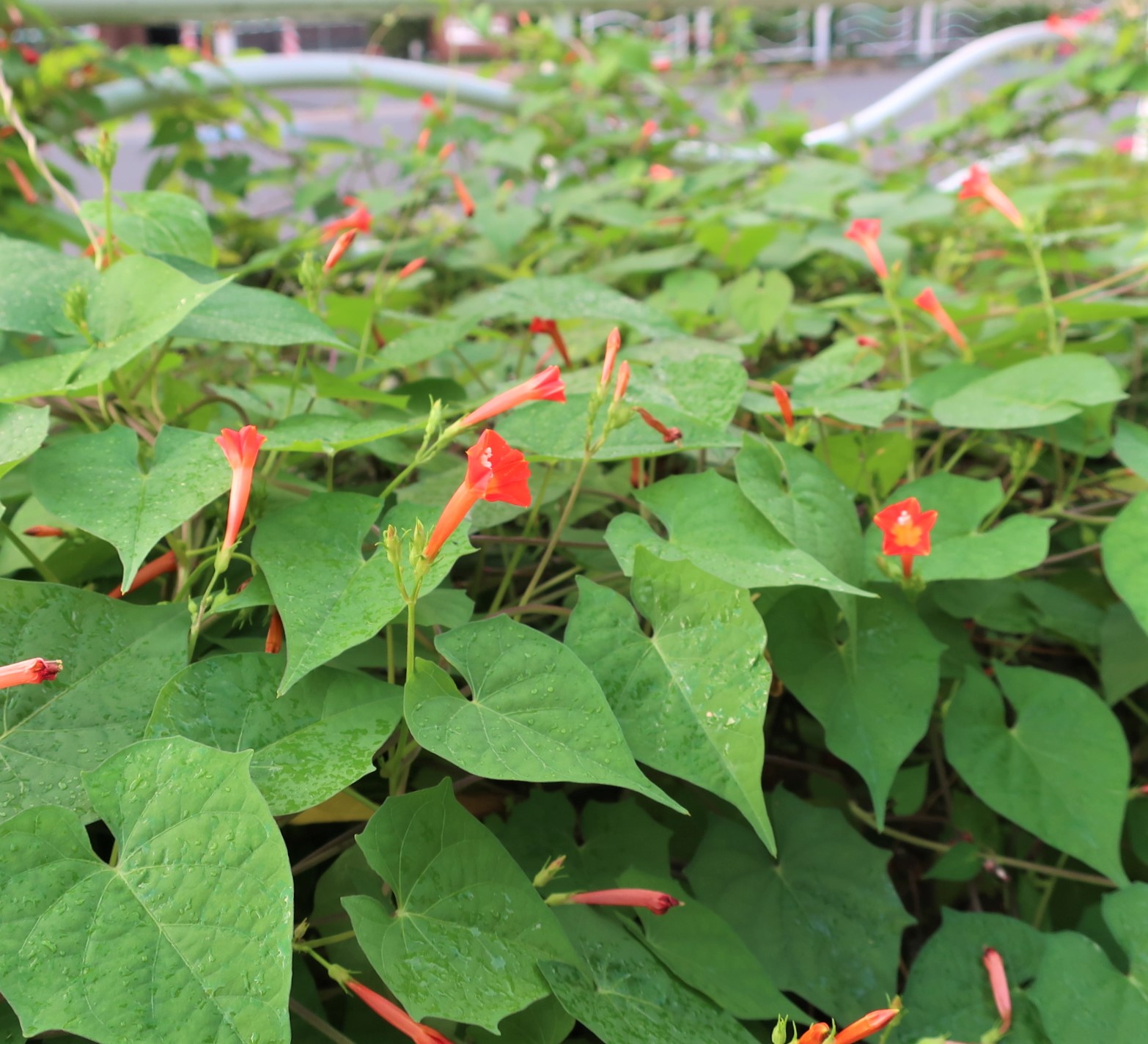 These are flowers of Ipomoea coccinea or more commonly red morning glory. They're tiny but stood out on the background of bright green leaves. In Japan, the red morning glory means "You're always adorable" because its flowers are adorable and "I'm busy" as it's busy producing seeds and flowers at the same time while rapidly growing twining vines.